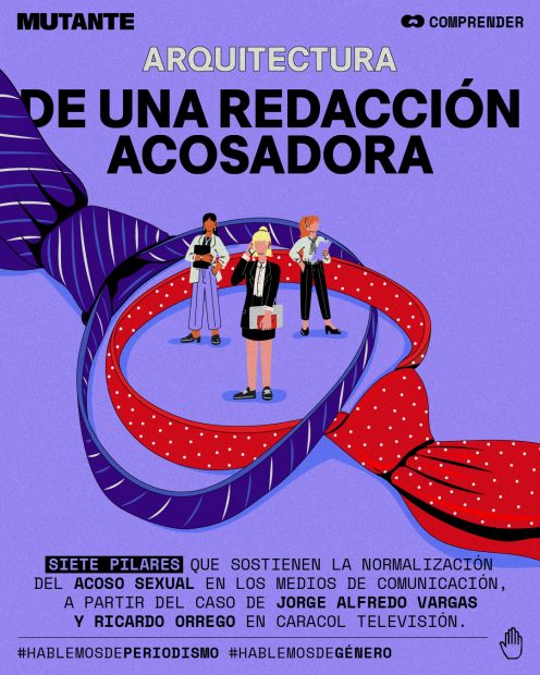 A raíz del caso de acoso sexual en Caracol Televisión, y la ola de denuncias derivada de este, construimos esta arquitectura de una redacción acosadora con aportes de Fabiola Calvo Ocampo, fundadora de la Red Colombiana de Periodistas con Visión de Género, y Laura Castrillón-Guerrero, psicóloga feminista y magister en Estudios Culturales.