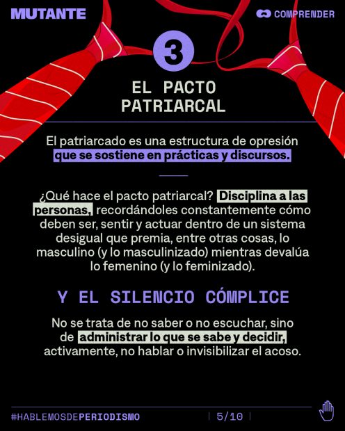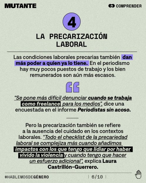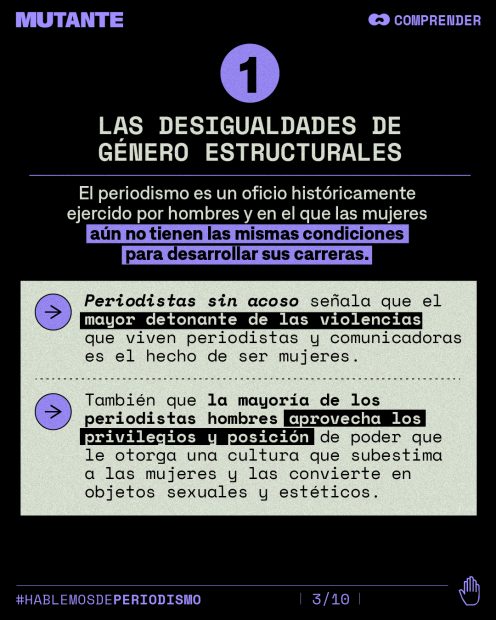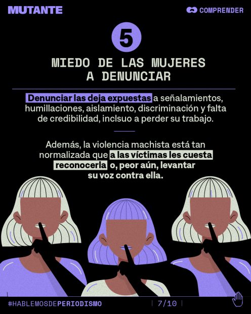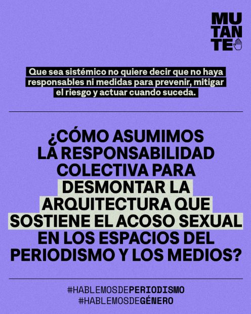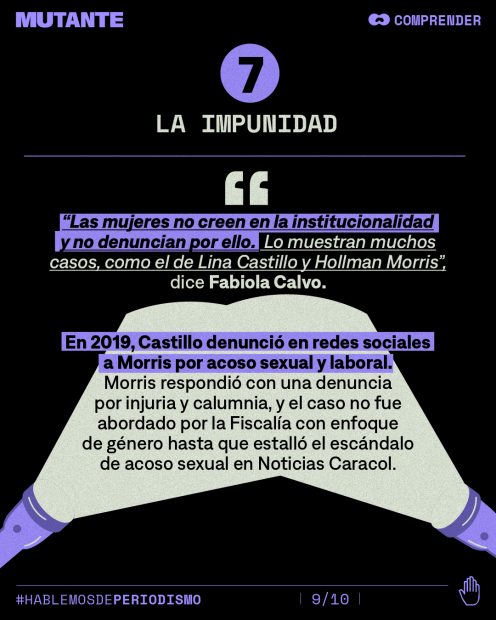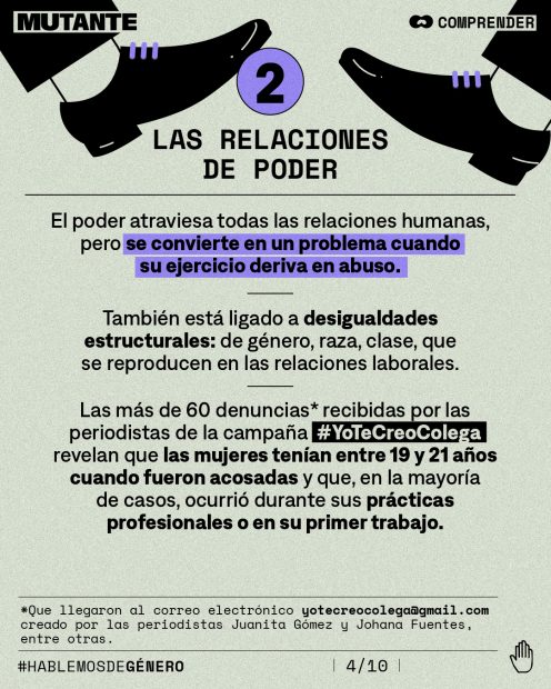 El 55 % de las mujeres encuestadas para el informe Periodistas sin acoso (elaborado por la Red Colombiana de Periodistas con Visión de Género) dijo haber vivido acoso sexual y que las personas que más ejercen esta violencia son sus colegas hombres (51,3 %), seguido por sus jefes o supervisores (38,8 %) y las fuentes (27,2 %).