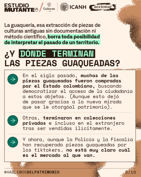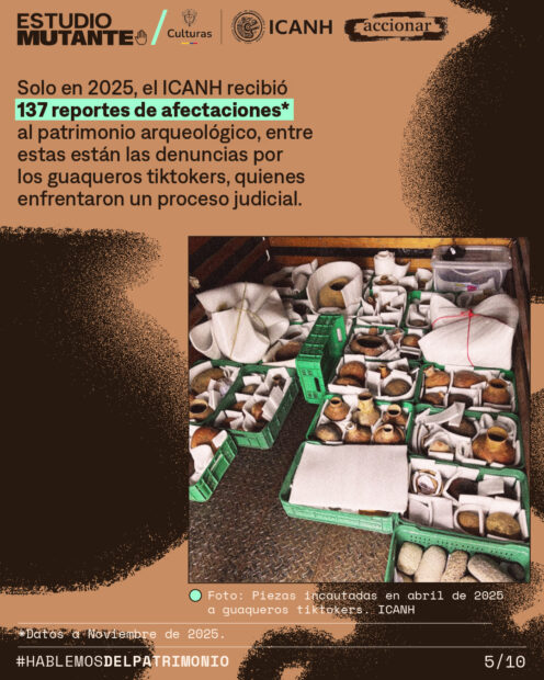 En 2025, el ICANH recibió 137 reportes de afectaciones al patrimonio arqueológico entre las que se cuentan denuncias por unos guaqueros que estaban usando TikTok y otras redes sociales para amplificar sus prácticas, y quienes enfrentan actualmente un proceso judicial.