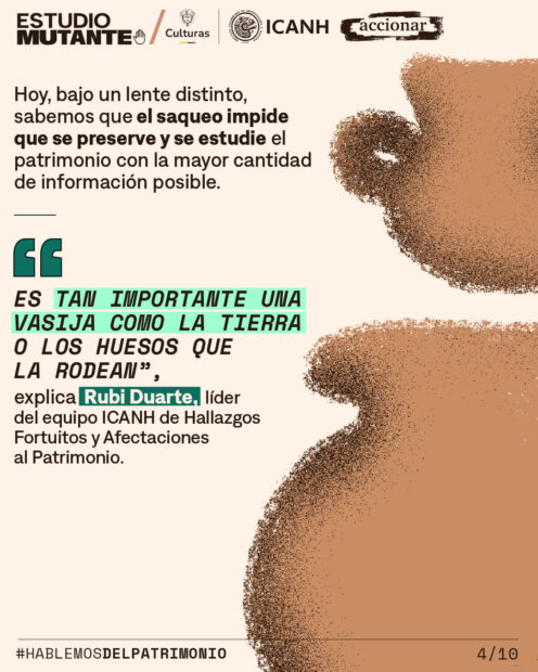 El saqueo impide que se preserve y se estudie el patrimonio arqueológico con la mayor cantidad de información posible. Como lo explica Rubi Duarte, del ICANH: “Es tan importante una vasija como la tierra o los huesos que la rodean”.