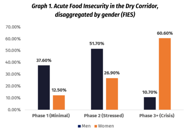 El Integrated Food Security Phase Classification (IPC) clasifica la inseguridad alimentaria en tres categorías: Fase 1 (mínima), Fase 2 (estresada) y Fase 3+ (crisis o peor). El estudio Women are the Early Warning: Gender & Food Insecurity in the Dry Corridor of Honduras, realizado también en Choluteca, demostró que las mujeres enfrentan condiciones de hambre más críticas que los hombres: el 60,6 % de ellas se encuentra en la fase 3+, frente a solo el 10,7 % de los hombres. Lo que quiere decir que cuando la escasez de alimentos golpea, son las mujeres quienes cargan con el hambre más severo.