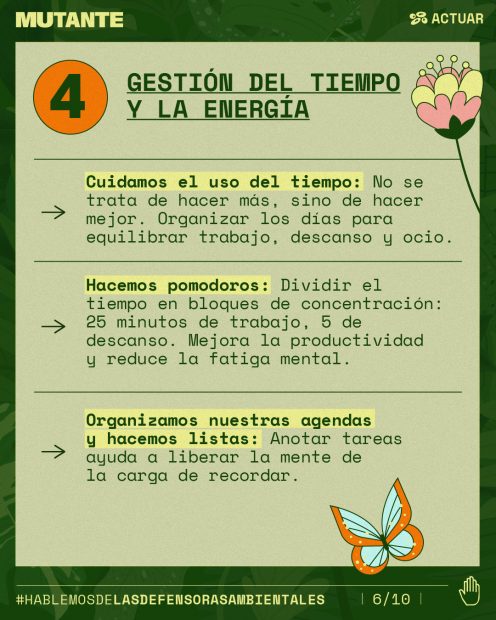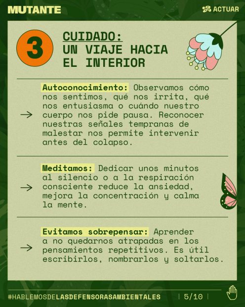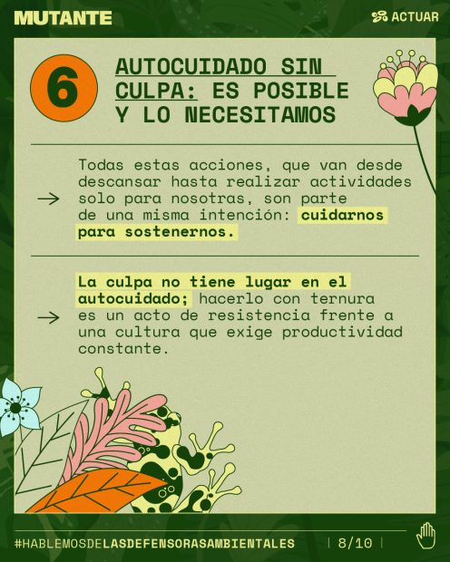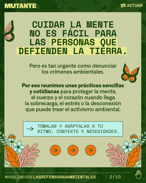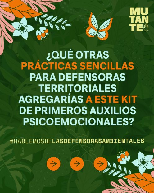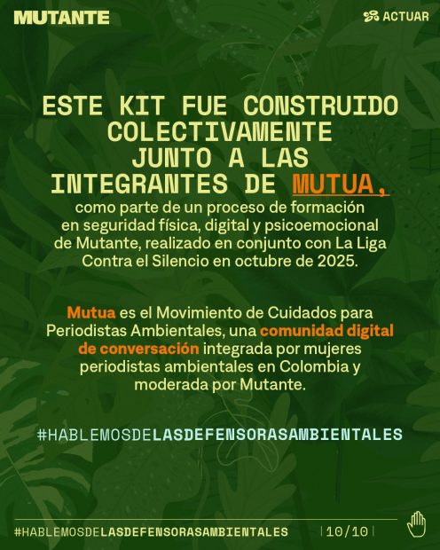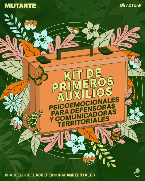 Las periodistas y defensoras ambientales de MUTUA (el Movimiento de Cuidados para Periodistas Ambientales creado por Mutante) construyeron este kit de primeros auxilios psicoemocionales a partir de sus propias experiencias y prácticas cotidianas: formas sencillas de recuperar la calma, recargar energía y cuidarse para poder sostener su labor si descuidarse a sí mismas.