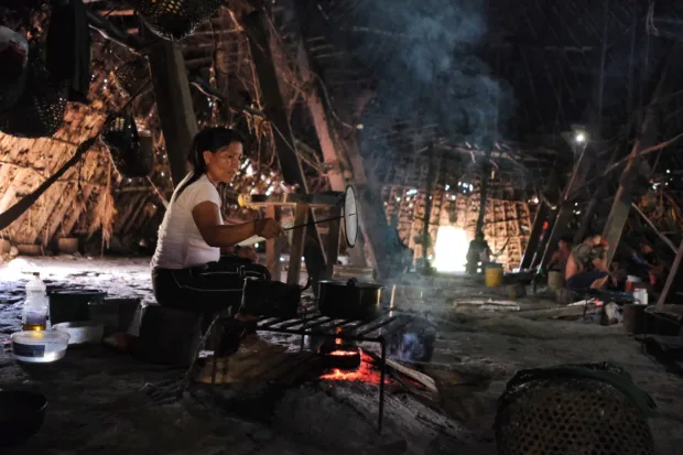 El bohío es el lugar donde está la cocina colectiva. Es un sitio donde hacen presencia los espíritus, donde se consolida su vínculo ancestral y donde ocurre la transmisión de saberes. Es una estructura irregular hecha con hojas de palma y madera, lo suficientemente grande para albergar a cientos de personas. Alrededor de este bohío hay algunas casas que fueron construidas por el Estado y que ya cuentan con sus propias cocinas. Un miembro de la comunidad nos comentó que, hace ocho años, no existían tantas cocinas “privadas”, pues esto es ajeno a su cosmovisión y que, por ende, ha implicado una reestructuración de sus costumbres.
