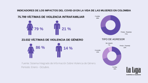 No ha sucedido solo en Colombia, como muestra este reportaje publicado por la alianza periodística Centinela COVID-19, donde participó La Liga contra el Silencio. Estudios internacionales sugieren que la violencia contra mujeres creció en todo el mundo durante el confinamiento debido a la crisis de salud pública. Las llamadas de auxilio continuaron, pero miles de mujeres dejaron de llamar por falta de saldo en sus teléfonos o porque viven con sus agresores.