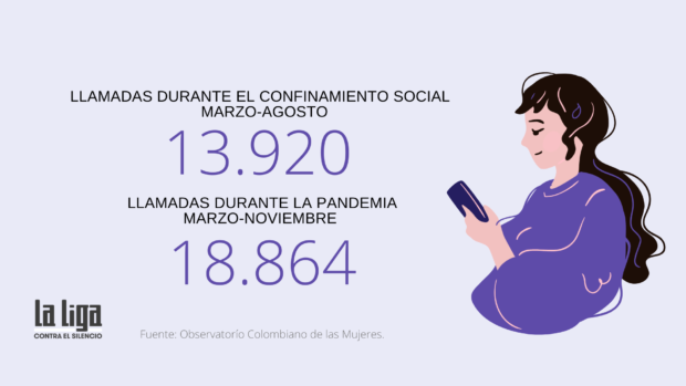 Las cifras también revelan un aumento de las agresiones. La línea 155, que opera la Consejería para la Equidad de la Mujer en todo el país en alianza con la Policía Nacional, atendió 13.920 llamadas entre marzo y agosto. Pasaron de 35 a 85 llamadas diarias. En seis meses de confinamiento, la línea 123 de la Policía también vio un aumento del 14 % en las llamadas.