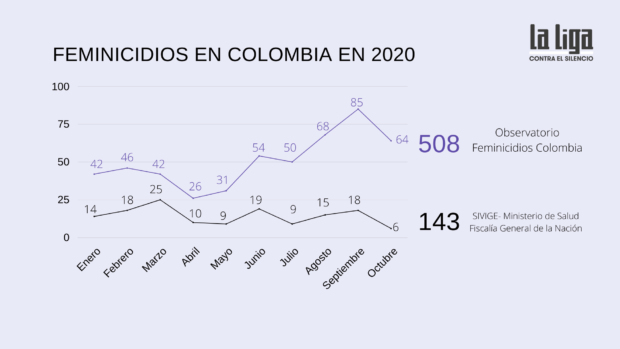 Entre el 24 de marzo y el 26 de octubre de este año se registraron 143 feminicidios en Colombia, según estadísticas del Sistema Integrado de Información sobre Violencias de Género, del Ministerio de Salud. Pero las organizaciones de mujeres aportan una cifra más alta: el Observatorio Feminicidios Colombia contabilizó 271 asesinatos por motivos de género entre marzo y agosto, durante el confinamiento obligatorio.