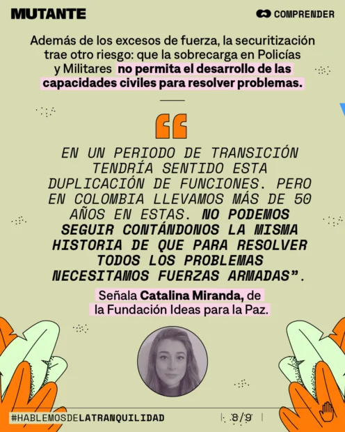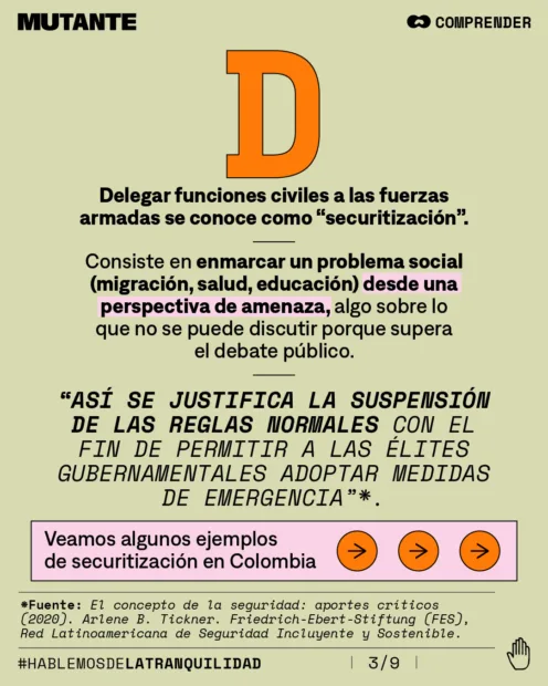 ¿A qué se debe esa presencia cotidiana de los militares en asuntos civiles? Durante años, en Colombia ha habido un proceso de securitización que ha implicado a fuerzas armadas en tareas civiles.