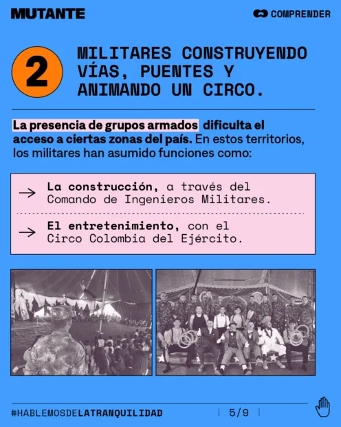 🎪 Los policías y militares en Colombia tienen roles inusuales en otros países: apoyan campañas de turismo, están metidos en la construcción de vías y carreteras, llevan proyecciones de cine a territorios apartados y tienen un circo.