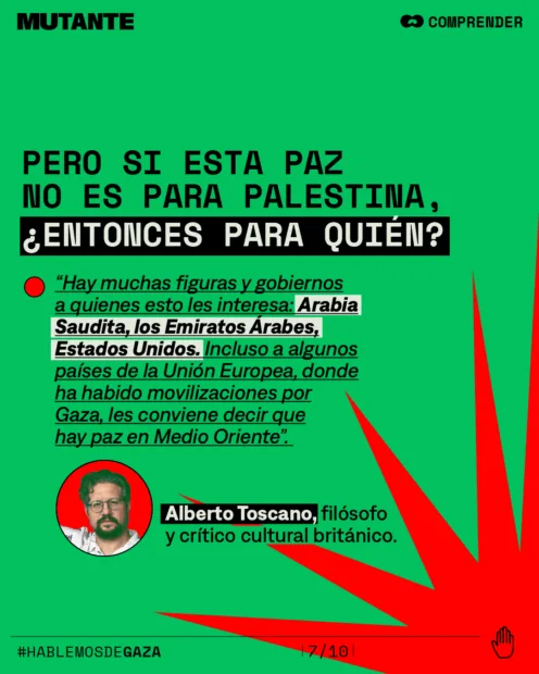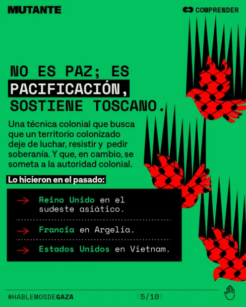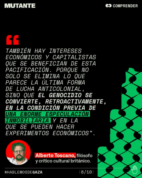 👉 El filósofo Alberto Toscano lo llama por su nombre: pacificación, no paz. Una técnica colonial que busca eliminar la resistencia y neutralizar la lucha anticolonial y anticapitalista que hoy encarna Palestina.