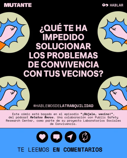 Este cómic adapta una historia real investigada por el Public Safety Research Center y narrada junto a Relatos Ñeros, y muestra cómo la organización comunitaria puede ser una salida real a los conflictos de convivencia.