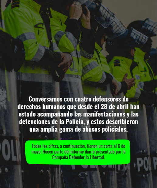 A las vidas perdidas durante las recientes manifestaciones que iniciaron el 28 de abril de 2021 en Colombia se le suman cientos de abusos impartidos por la fuerza pública. La organización Campaña Defender la Libertad ha llevado el registro de estas denuncias, encuentra en este informe algunas de las cifras en lo corrido del 28 de abril al 6 de mayo de 2021.