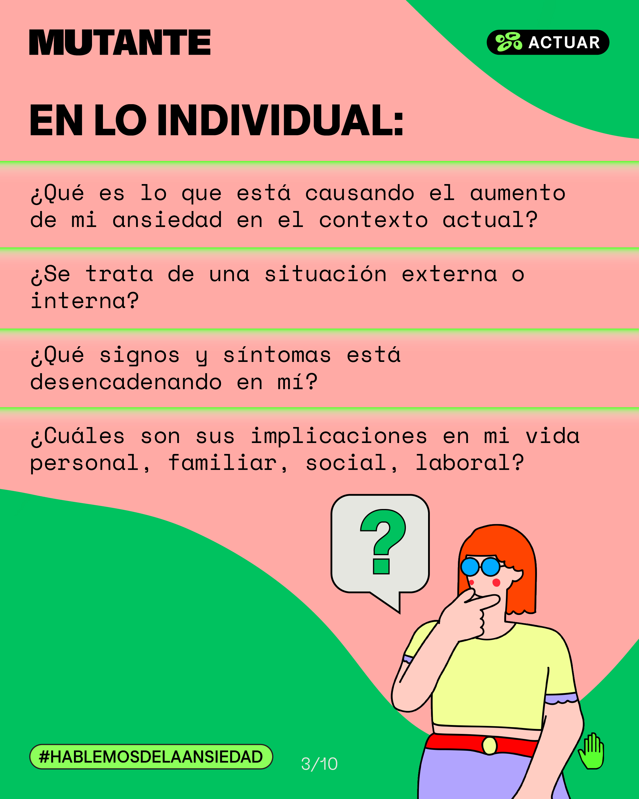 A partir de una conversación con el psicólogo chileno Eduardo Sandoval elaboramos este breve manual en el que encontrarás diversas preguntas para hacerle a tu ansiedad en diferentes ámbitos de tu vida. Quizá abordarla como un ser al que se le puede cuestionar e indagar su origen y manifestación sea útil para encontrar respuestas o entender las preguntas.
